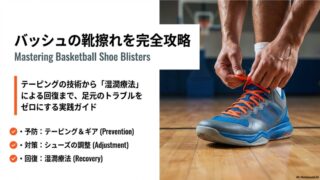 バッシュの靴擦れをテーピングで防ぎたい方へ。バスケ特有の激しい動きによる痛みを抑える部位別の巻き方や、剥がれにくいコツを徹底解説します。バッシュの靴擦れにテーピングを活用するだけでなく、ヒールロック等の結び方や最新クリームでの予防策、水ぶくれの正しい治し方も網羅した完全ガイドです。