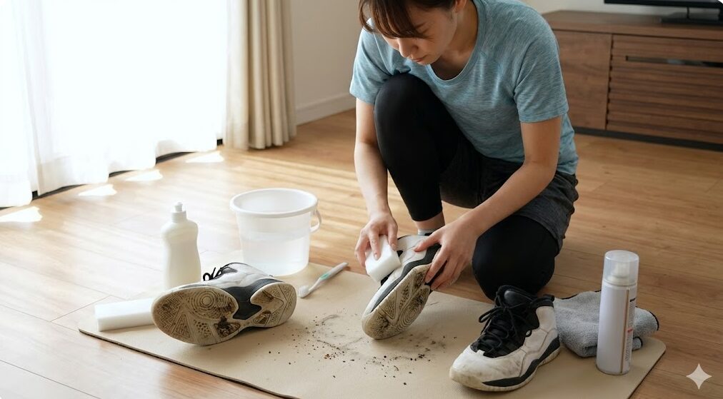 メンテナンス方法は非常にアナログですが、効果は絶大です。練習から帰ったら、バッシュの裏を明るい場所で観察し、グレーの塊が詰まっている箇所を探します。