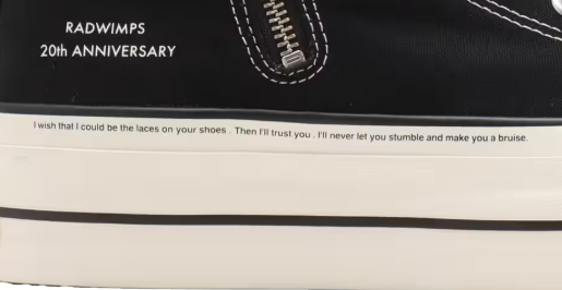このスニーカー最大の特徴であり、ファンとして最も胸が熱くなり、涙腺が緩んでしまうポイントが、ソール側面(フォクシングテープ)にプリントされた文字のデザインです。ここには、RADWIMPSの名曲『傘拍子』の一節が、英語に翻訳された状態で刻まれています。