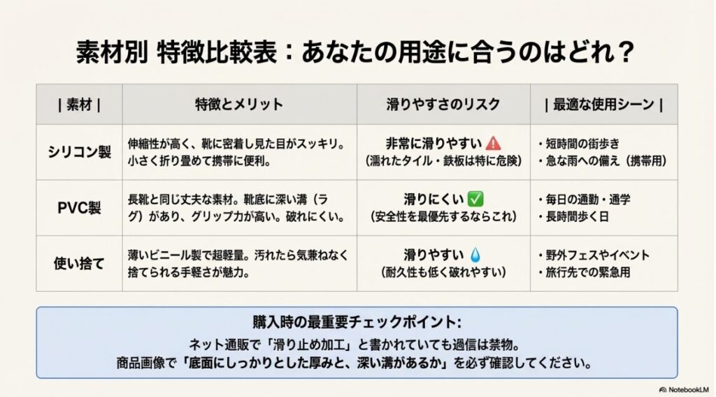 スニーカー用のレインカバーを選ぶ際、デザインや価格だけで決めてしまうのは危険です。実は、使われている素材によって「滑りやすさ」や「耐久性」が天と地ほど異なるからです。大きく分けて「シリコン製」「PVC(塩化ビニル)製」「使い捨て(ビニール)製」の3種類があり、それぞれの特性を理解していないと、駅のタイルやマンホールの上で転倒するリスクが高まります。